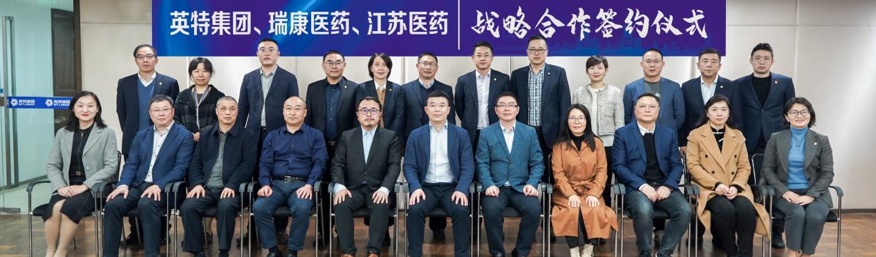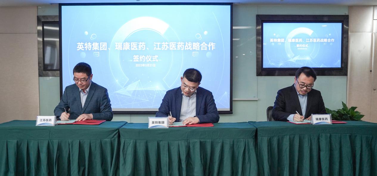簽約儀式上,英特集團董事長應徐頡、瑞康醫藥副總經理楊博、江蘇醫藥總經理陳冬寧分別代表各方簽署戰略合作協議。